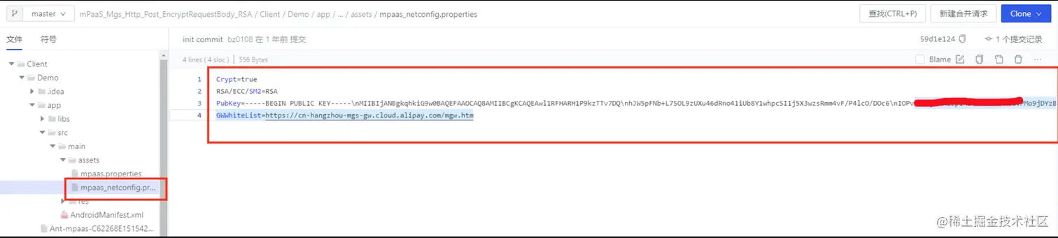 STEP1 Android 端的加密方式和公钥是配置在 mpaas_netconfig.properties 文件下的,如图: