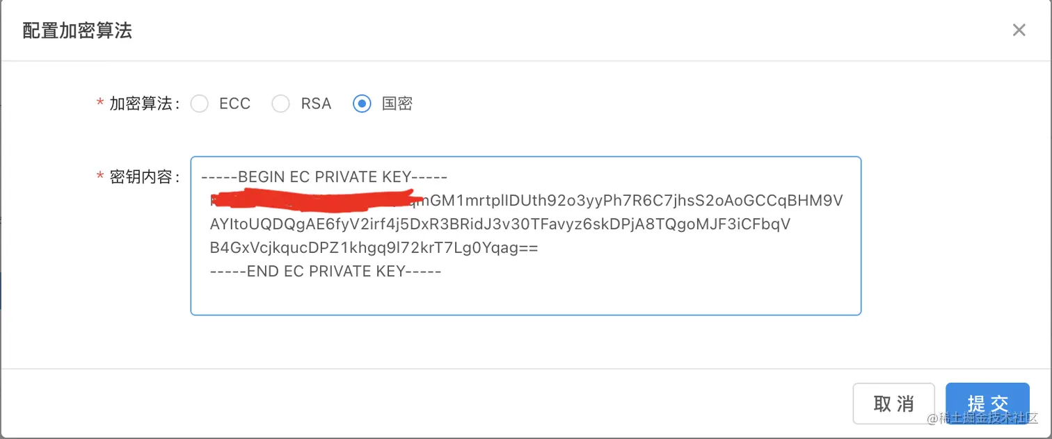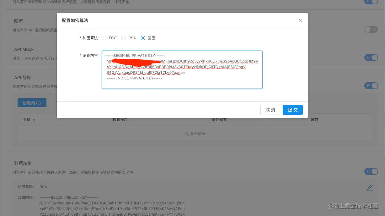 STEP4 将 SM2 的私钥按正确格式填写到输入框内,点击提交。之后就能在这里看到已经配置好的两种加密方式: