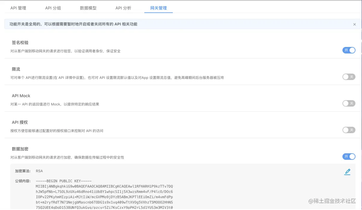 STEP1 打开移动开发平台->移动网关->网关管理:当前网关已经开启了数据加密(这里示例是RSA)