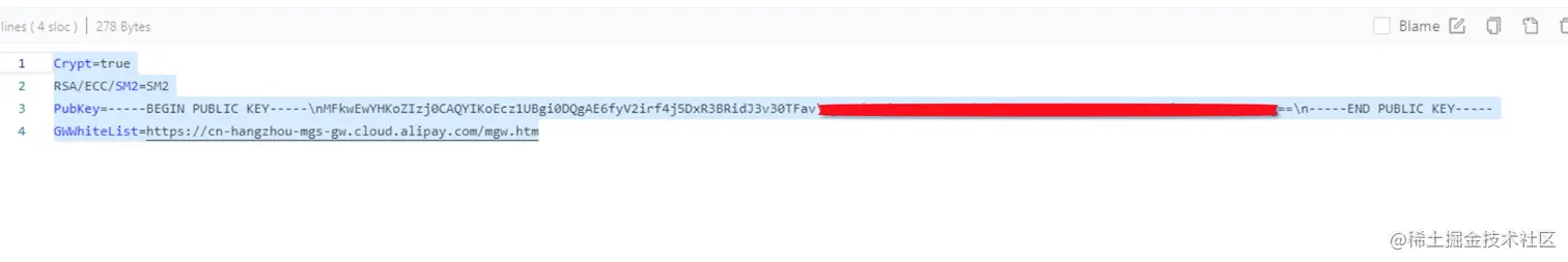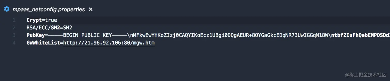 STEP2 此时将已生成好的 SM2 公钥按正确格式替换上述 mpaas_netconfig.properties 里的对应 value,更换后如下图: