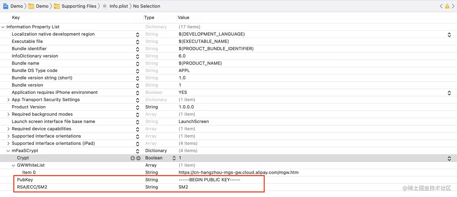 STEP1 iOS 客户端的加密方式和公钥是配置在 info.plist 下的,详情见图:
