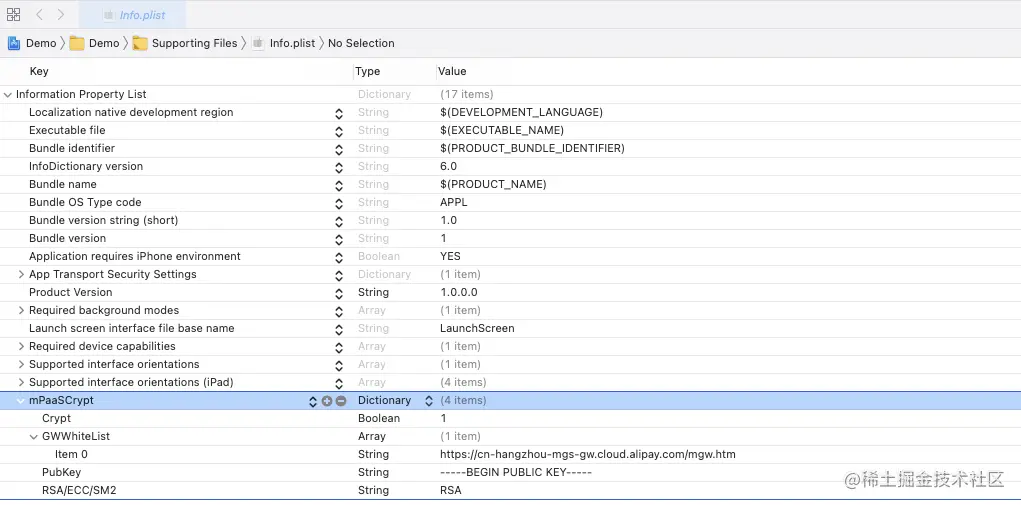 iOS客户端的加密方式和公钥是配置在info.plist下的,详情见图