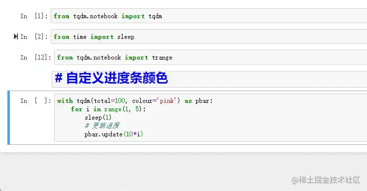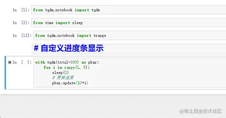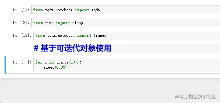 这里面的 tqdm(range()) 我们也可以用 tqdm 提供的 trange() 来代替,可以简化代码。