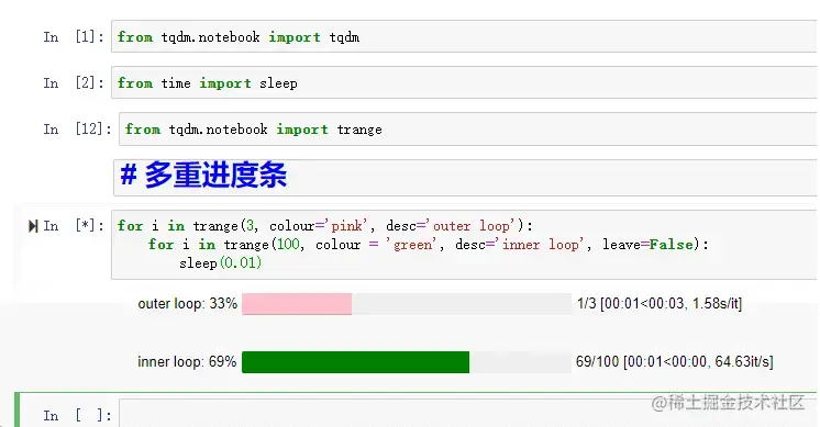 这里我用两层 for 循环实现了嵌套,并且将内层的 参数 leave 设置为 False ,意思是内层的进度条每执行一次都会消失。并且给内循环设置绿色,外循环设置粉色。