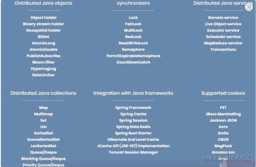 但是redisson这个客户端可有点厉害,笔者在官网截了仅仅是一部分的图:
