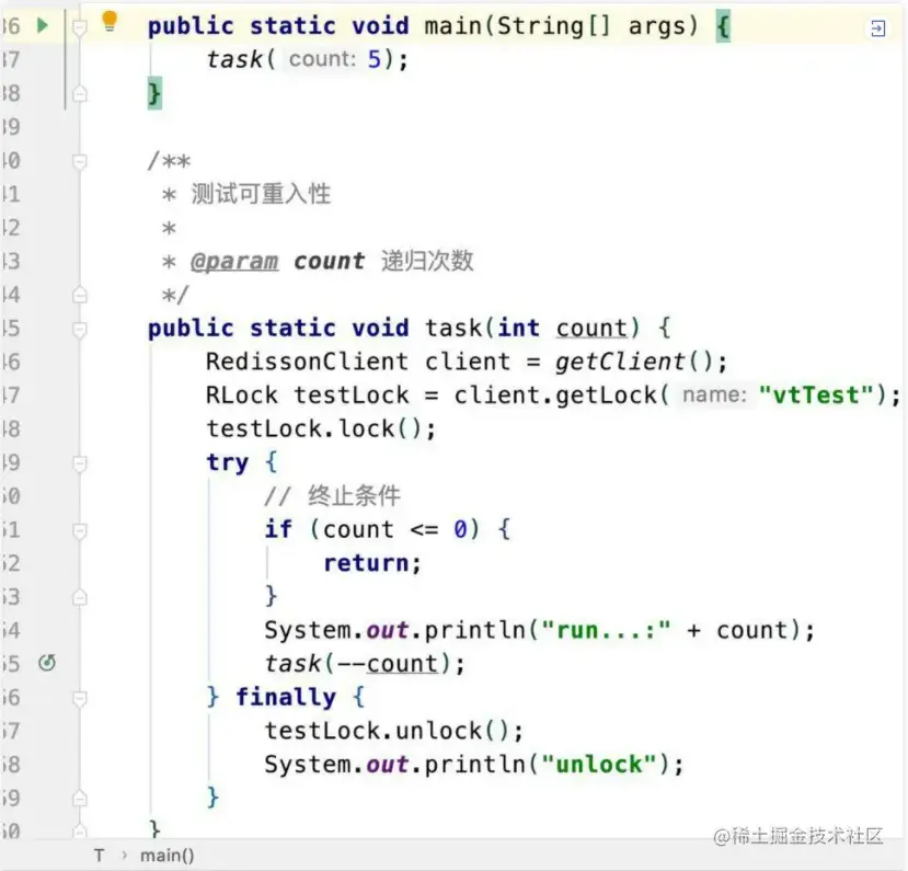 其实笔者仔细看了一下,加锁解锁的lua脚本考虑的非常全面,其中就包括锁的重入性 ,这点可以说是考虑非常周全,我也随手写了代码测试一下: