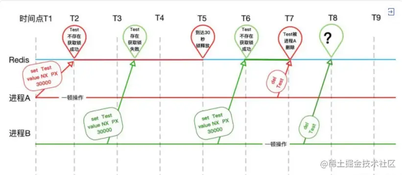进程B 在T6 开开心心拿到锁不到一会,进程A 操作完成,回手一个del ,就把锁释放了。