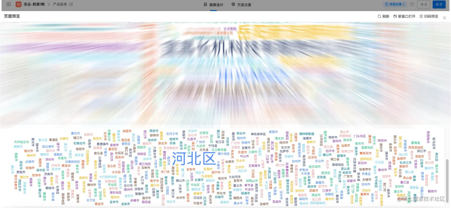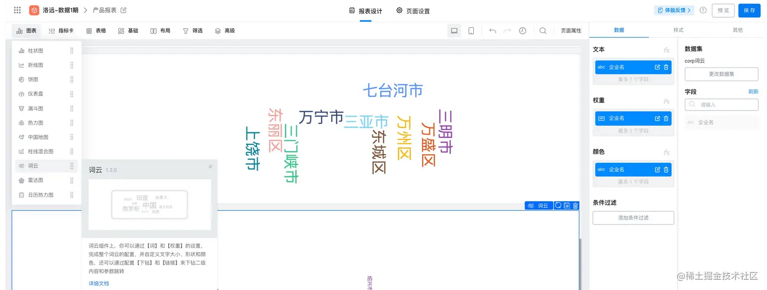 通过【词】和【权重】的设置,并自定义文字大小、形状和颜色,还可配置【下钻】和【链接】来查看内容跳转,做出热词效果分布。