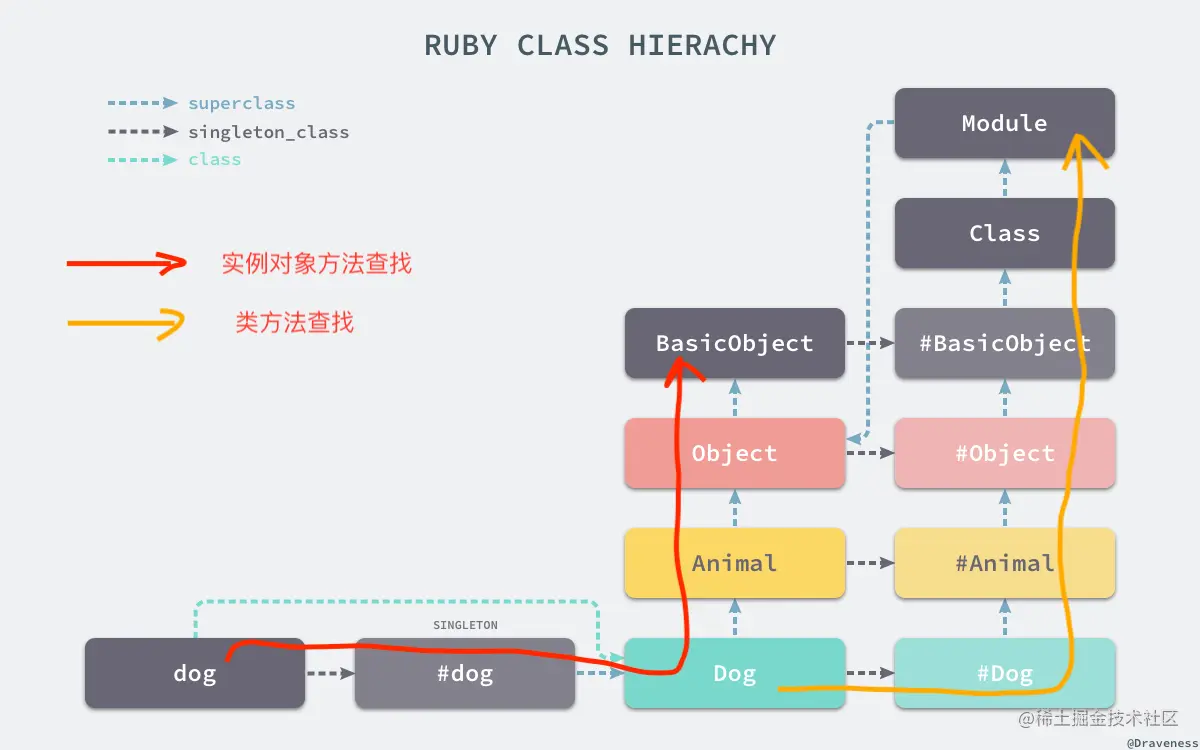 Dog开始寻找定义的方法,向右一步,进入自己的 单例类 #Dog,然后应该做什么,选择向上么?是走 他的父类Class,还是 应该往 单例类的继承链往上找呢?