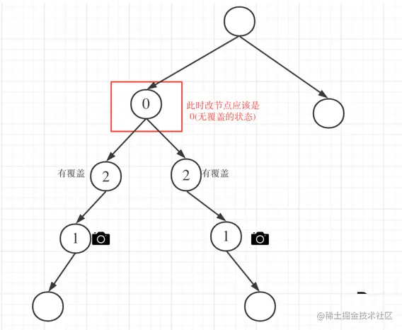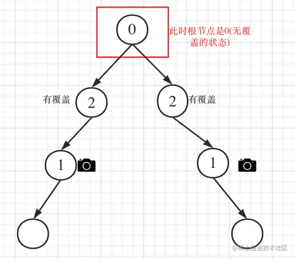 如果是以下情况,其实就是 左右孩子节点有一个有摄像头了,那么其父节点就应该是2(覆盖的状态)