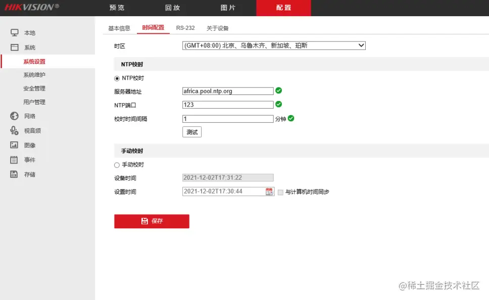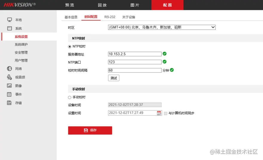 既然摄像机会在注册EasyGBS的时候同步时间,那么我们就在摄像机的时间配置里面修改摄像机的时间参数,将时间配置更改为NTP校时。