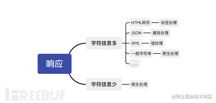 到这里读者可能想知道怎么划分为三段,简单来说没有一定的定式,主要就是经验,我们是根据得到的网页骨架字符的总长度来确认的,比如总长度在5000-6000之间,那么三段则是0-1000,1000-4xxx,4xxx-5xxx这样。当然在某些情况下是不用区分三段的,因为有时候获得骨架的MD5会完全匹配。当然这只是其中一种情况,还有一种是响应返回值直接为json,不存在html标签,这个时候我们一般会将json的value值置空再来做对比。当然网页返回的情况的纷繁复杂,除了json之外还有xml、还有纯字符串等等,这些都需要额外进行特殊处理。我简化为下图。最后利用title等其他信息进行聚合操作,完成之后则可得到N个集合(每个集合又包含N个页面)。