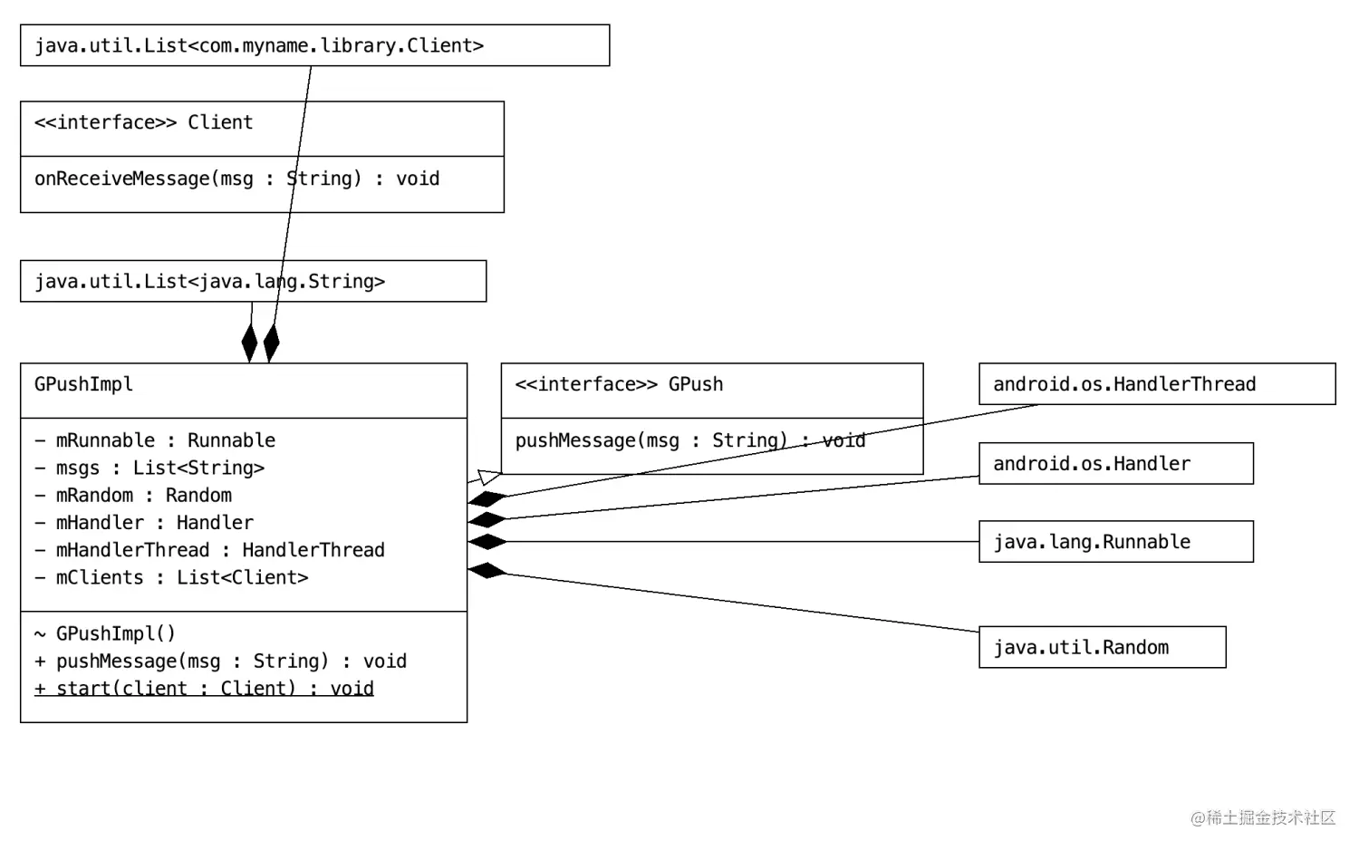 从下面给出 UML 图可以看出,只需要一个方法就可以监听到新闻推送了,GPushImpl#start(Client client)。