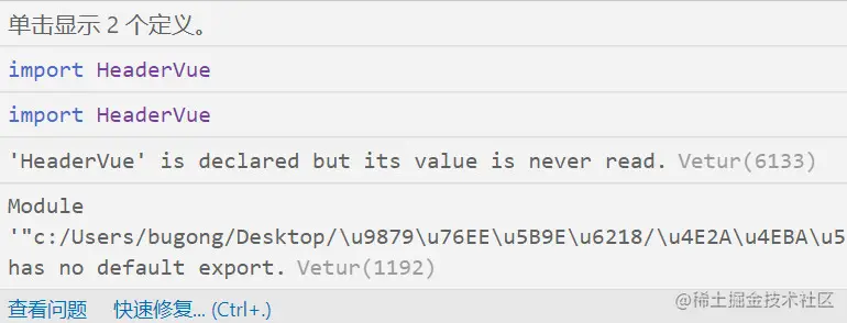 后来才注意到这个Vetur插件给的提示,果断卸载掉Vetur,然后就正常了。不过卸载Vetur导致在Vue模板中直接输出vue就不会自动补全代码了。