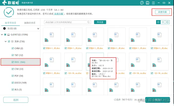 结束快速扫描后就可以按照上方的提示,进入深度扫描了。深度扫描可以更加深度地对文件进行扫描,检索出更多丢失的word文件。