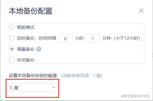 步骤三:点击上方的本地备份设置,设置备份的时间间隔和备份文件存储的磁盘。
