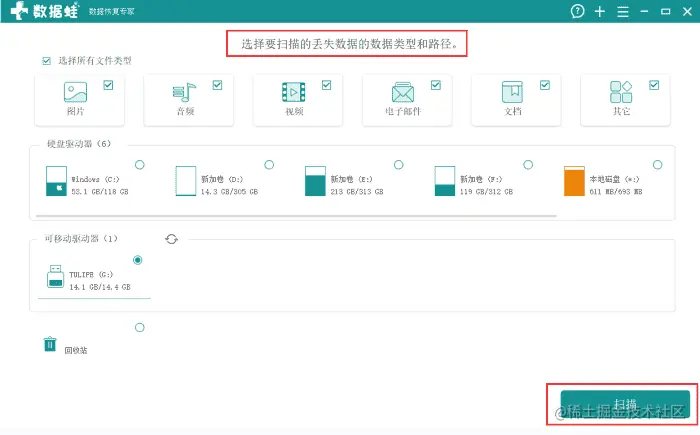 运行软件,在首界面依据提示,选择word文档丢失的路径,全选数据类型,可以更加深度地扫描数据文件。