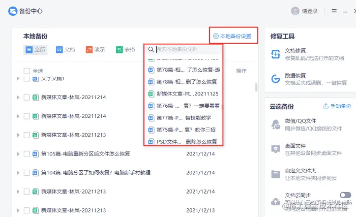步骤二:进入备份中心后即可搜索备份文件。