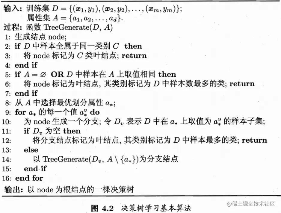 上面一节简述了决策树的定义和功能,本节讨论决策树的构造过程。下图是周志华老师《机器学习》一书中对决策树构造过程的伪代码描述。