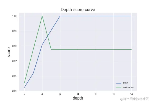 在3.4.1节中我们提到过,原始数据集通常会被划分为训练集、验证集和测试集。验证集就是用来辅助判断模型是否过拟合的。随着训练进程的深入或决策树深度的增长,决策树在训练集上的性能表现会越来越好。但是如果我们将此模型用于预测验证集,其性能增长会在某一点开始停滞,甚至开始下降。下图描述了在Iris数据集上,一棵决策树随着深度增长在测试集和验证集上的得分曲线。可以看到在4层之后,测试集上的得分仍然在上升,但测试集的得分开始下降。此时决策树已经开始过拟合。