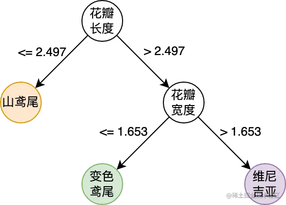 学习这个数据集获得的分类决策树可能有以下的形状(仅示意)。在决策树中,内部结点(非叶结点)代表一个用于分类的特征(如“花瓣长度”),结点下属的边代表判断条件(如“大于2.497”)。而叶结点代表一个预测分类。在推理一条未知分类的鸢尾花数据时,将其输入到决策树中:从根结点出发,根据每个结点的判断条件选择分支,最终抵达一个叶结点,即预测的分类。