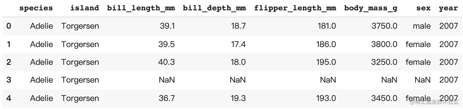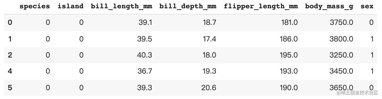 为了追求一点新鲜感,本文中的例子没有使用经典数据集Iris,而是使用了一个类似规模的帕默群岛企鹅数据集。数据集描述了南极洲帕默群岛上三种企鹅的喙长、喙宽、蹼长、体重和性别。本文中的Demo会学习企鹅的这些特征,预测企鹅的种类。