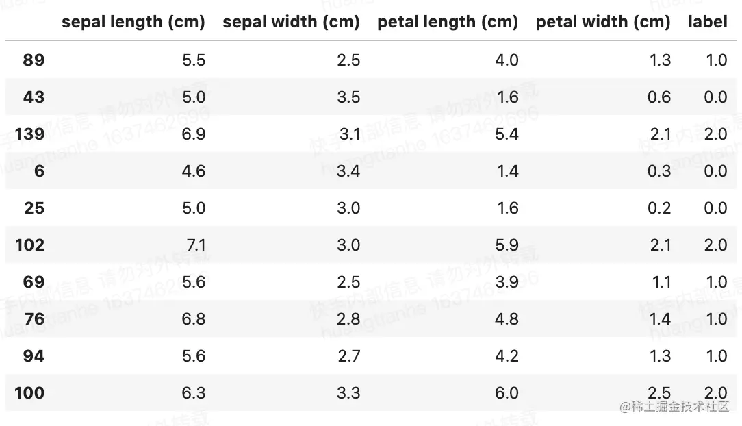 简而言之,决策树学习就是给定一组样本数据,包括特征取值及其对应的标签,训练出一个树形分类器来描述特征与其标签映射的逻辑。以久经考验的Iris分类数据集为例:特征(或称属性)包括花瓣长度、花瓣宽度、花萼长度和花萼宽度,标签为鸢尾花的种类(山鸢尾、变色鸢尾和维吉尼亚鸢尾)。下面是数据集的一个采样(左一列是样本序号,非数据)。