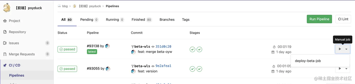 创建beta-XX 分支合并你的开发分支(会对包含beta关键字的分支进行自动构建),推到gitlab,会进行自动部署一次,点击右边的' deploy-beta-job '手动部署。