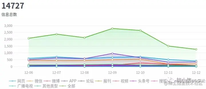 12月6日0时至12月12日23时,全网关于信创的舆情总量共14727条。传播趋势方面,前期舆情走势平稳,舆情热度在12月9日达到高峰,日声量2784条,周末热度走低。