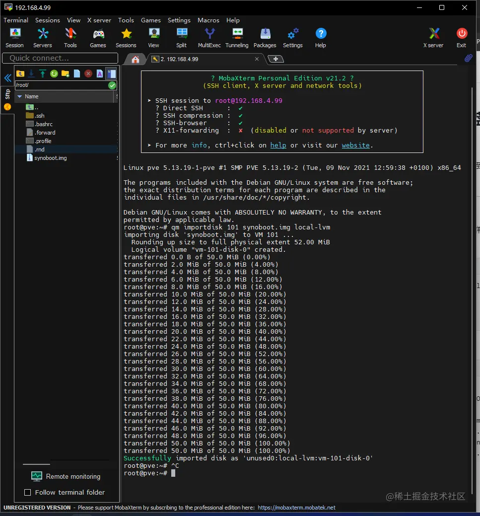 在MobaXterm的右边黑色区域,输入以下命令转换群晖引导盘,使它变成PVE虚拟机的格式(命令别照搬,100为第4步骤显示的VM ID):