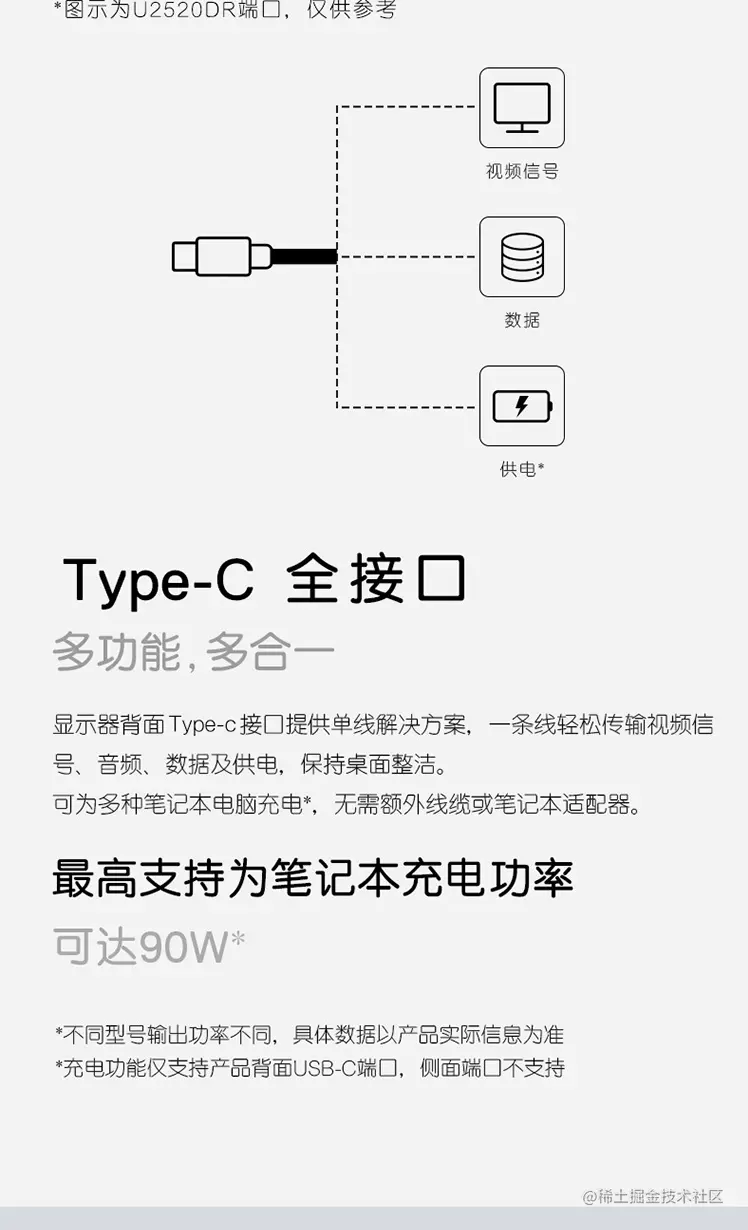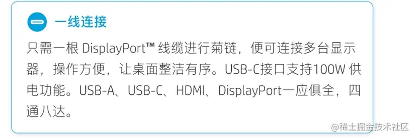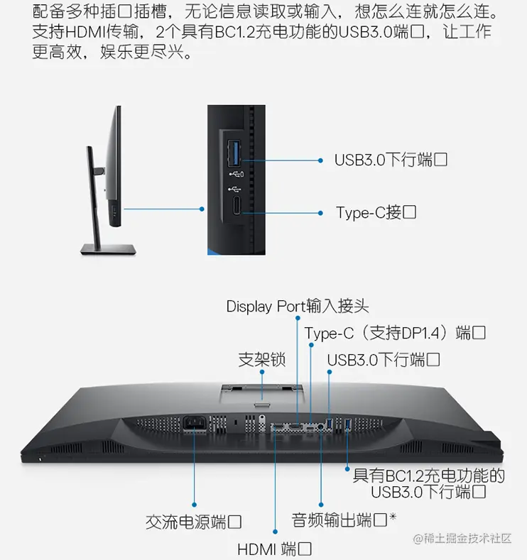 显示器支持USB扩展-FAQ 运维阿彬 2021-12-15 222 阅读1分钟 前言 Dell/HP 4K、1080HC普遍支持 type C 扩展USB接口 线缆1(双头tyepC -支持扩展/充电) 线缆2(C转DP-不支持扩展/充电) 使用方式: 通过typeC线连接笔记本+显示器。 显示器(左侧+后正下方)的USB-A接口可连接:鼠标、键盘、优盘、等设备。 Dell官方介绍 HP官方介绍