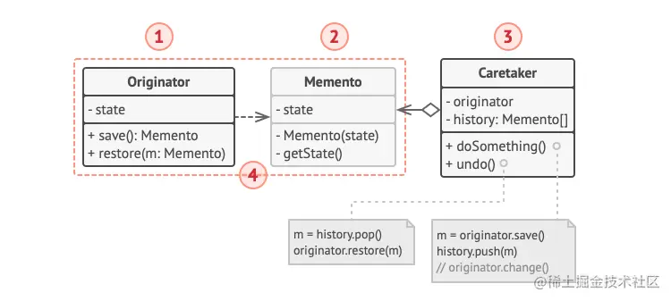 简单解释就是,我们只需要让对象本身,自己生成备忘录(构造、克隆、序列化等方式),而生成的这个快照就是备忘录 Memento,它只能够被创建对象 Originator 所访问。然后我们再通过一个限制了访问权限的接口去提供获取备忘录 Memento