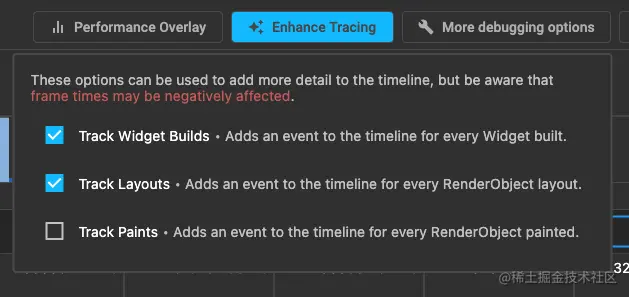 对于调试性能问题,新版的开发者工具 (DevTools) 添加了一个新的「增强跟踪」功能,用来帮助开发者诊断消耗较大的构建、布局和绘制操作引起的 UI 卡顿。