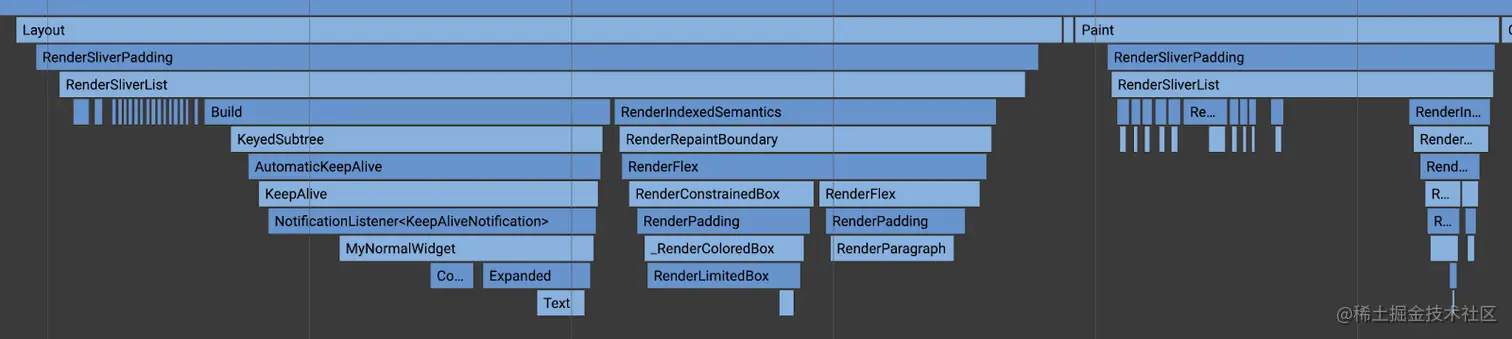 启用任何一个追踪功能后,时间轴中将视情况展示 Widget 的构建、RenderObject 布局和 RenderObject 绘制的事件。