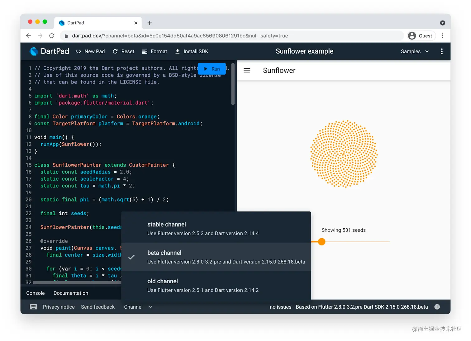 如果你想了解未来我们向 DartPad 添加新 package 的计划,请查看 Dart wiki 上的这篇文章。 还有另一个新的 DartPad 功能也非常方便,在此之前,DartPad 总是以运行最新的稳定版本运行。在新版本中,你可以使用状态栏中新的 Channel 菜单 来切换到使用最新的 Beta 渠道版本以及先前稳定版本 (我们称为 "old channel" 旧渠道)。