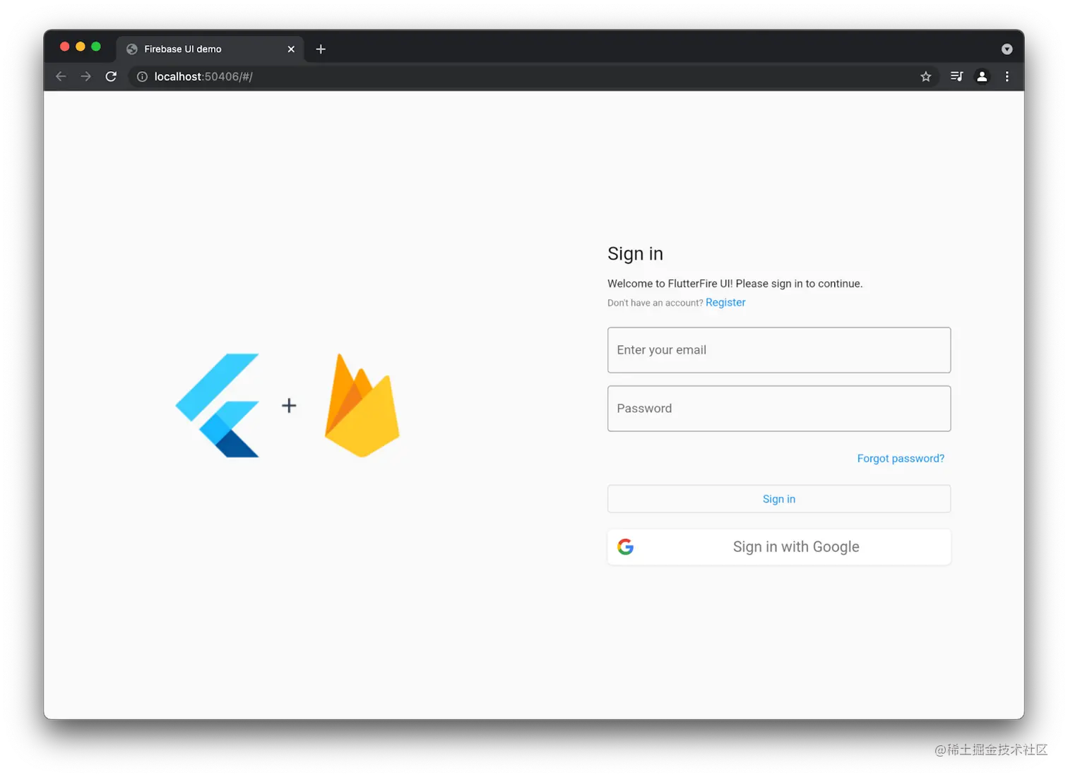 上面这个截图是移动端的身份认证,不过因为 flutterfire_ui 的 UI 是响应性设计,因此在桌面浏览器上,它会是这样的效果: