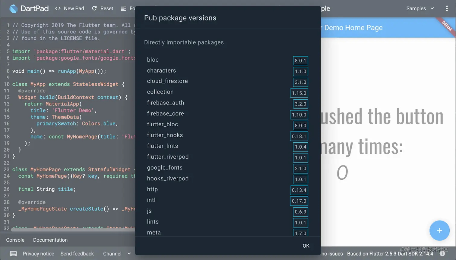 DartPad 团队会继续添加新的 package,如果你想查看当前支持哪些 package 的话,可以单击右下角的信息图标。