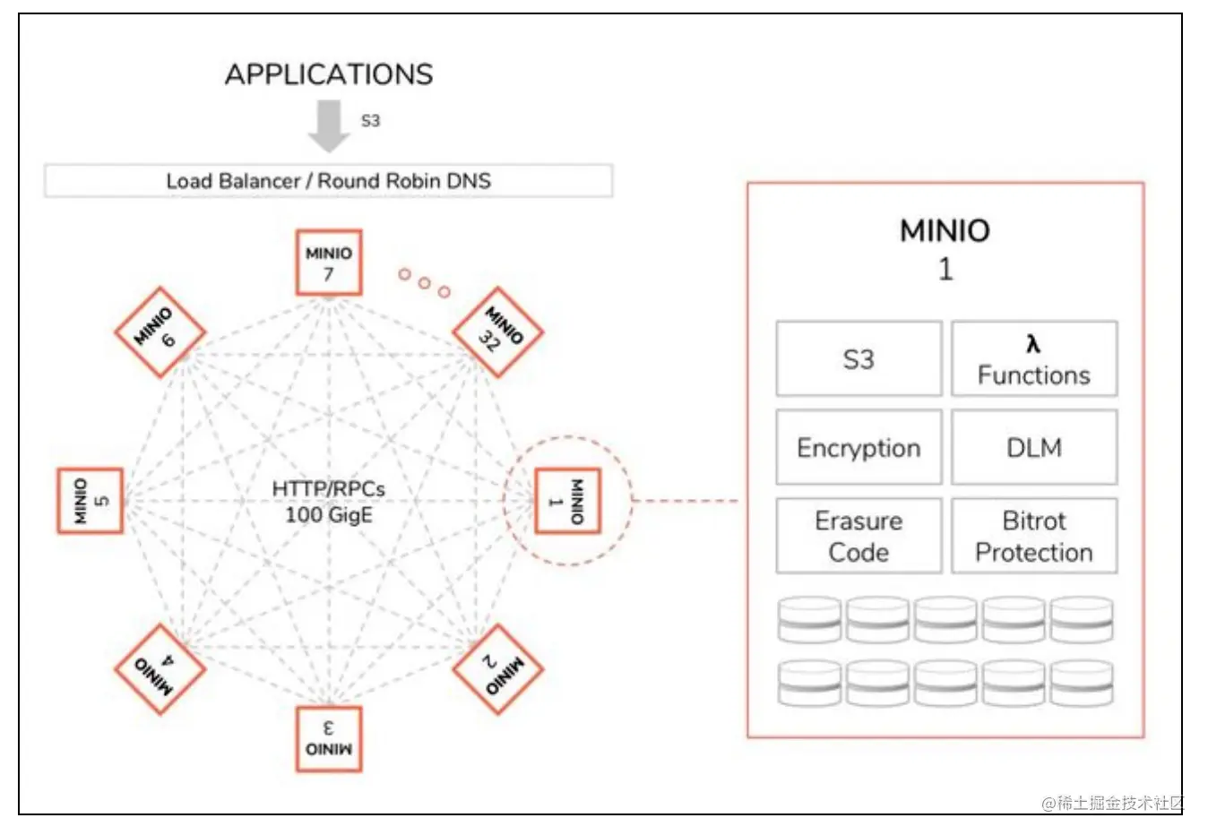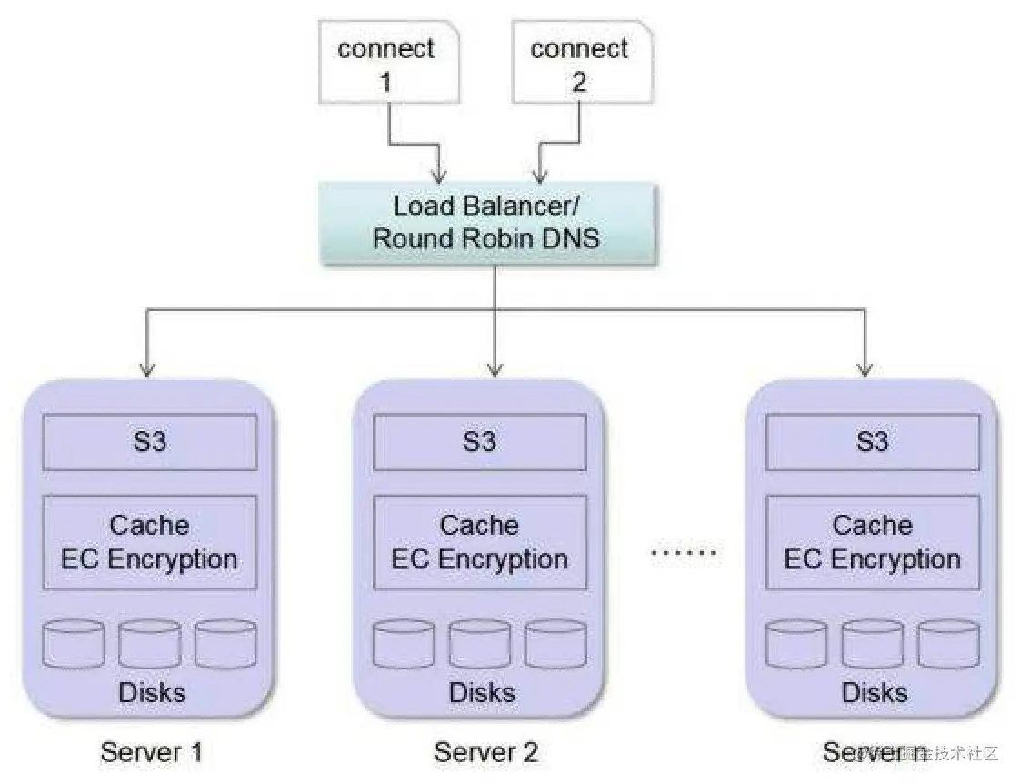 MinIO采用去中心化的无共享架构,对象数据被打散存放在不同节点的多块硬盘,对外提供统一命名空间访问,并通过Web负载均衡器或DNS轮询(DNS round-robin)在各服务器之间实现负载均衡。