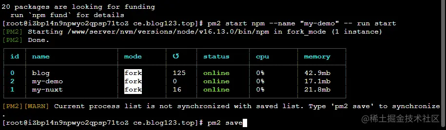 pm2 save //保存当前pm2 正在启动的NodeJS服务