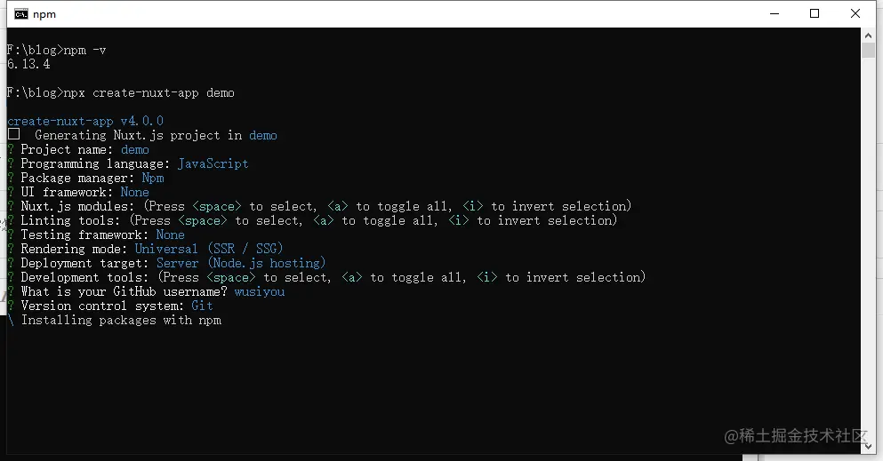 打开cmd,我们先来查询一下npm版本,确保安装了 npx(npx 在 NPM 版本 5.2.0 默认安装了);\
