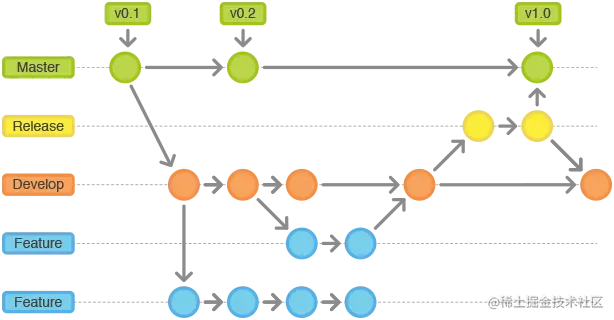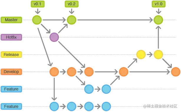 发布Release分支时,合并Release到Master和Develop, 同时在Master分支上打个Tag记住Release版本号,然后可以删除Release分支了。