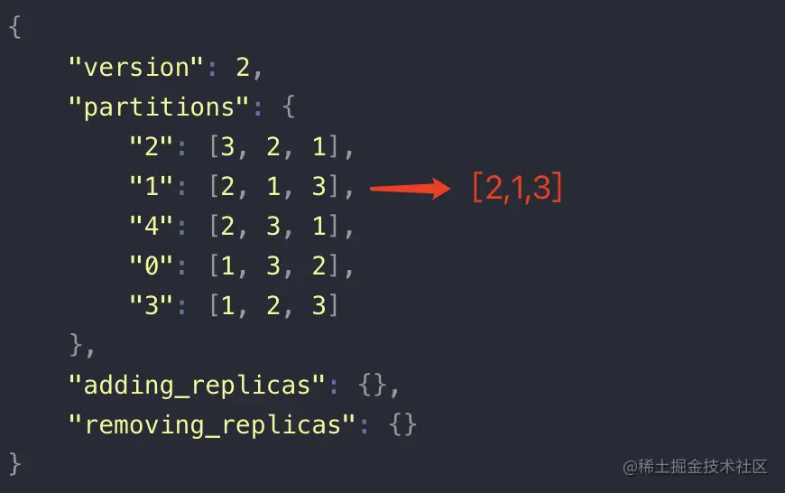 {"version": 2,"partitions": {"2": [3, 2, 1],"1": [2, 1, 3],"4": [2, 3, 1],"0": [1, 3, 2],"3": [1, 2, 3]},"adding_replicas": {},"removing_replicas": {}}