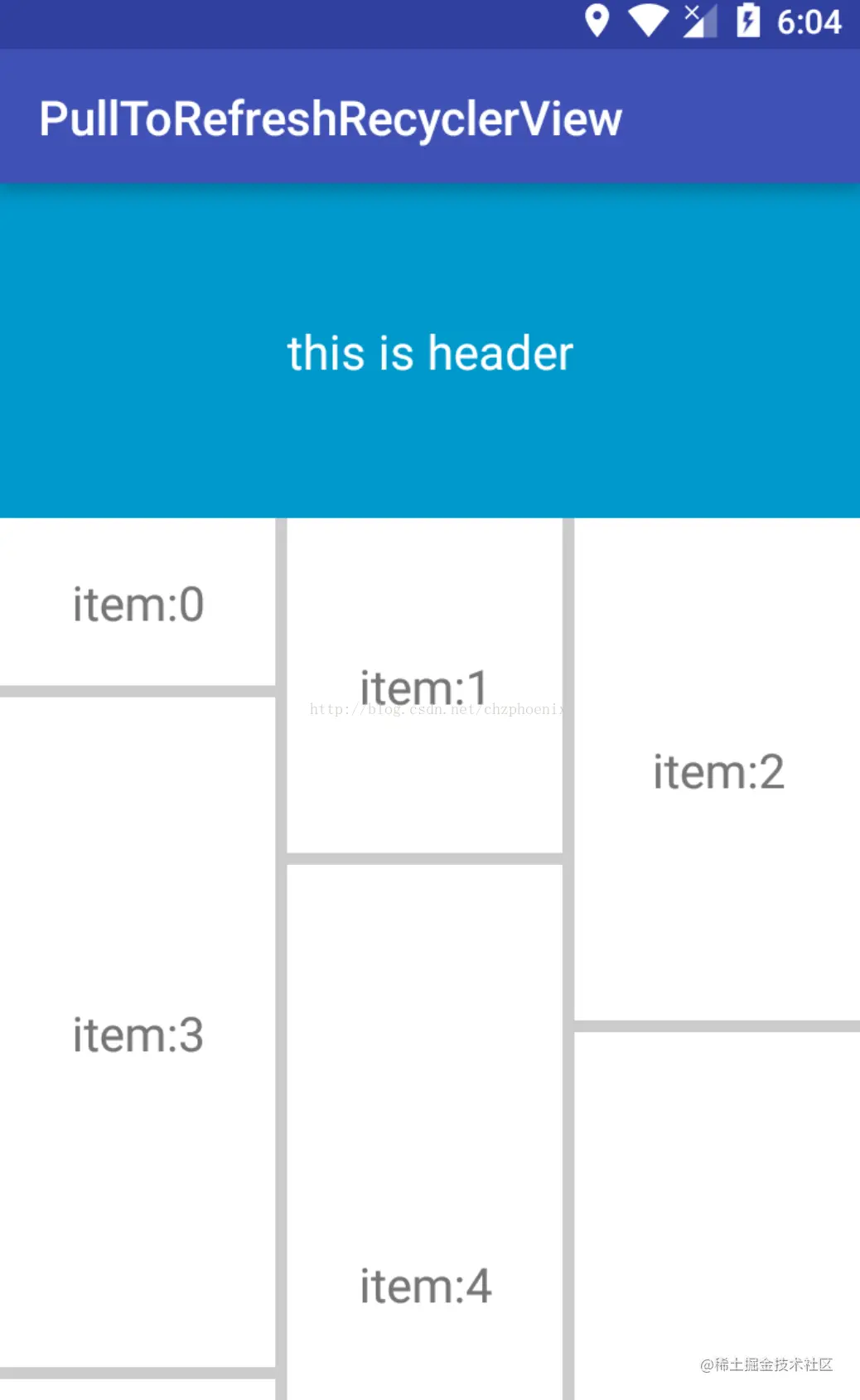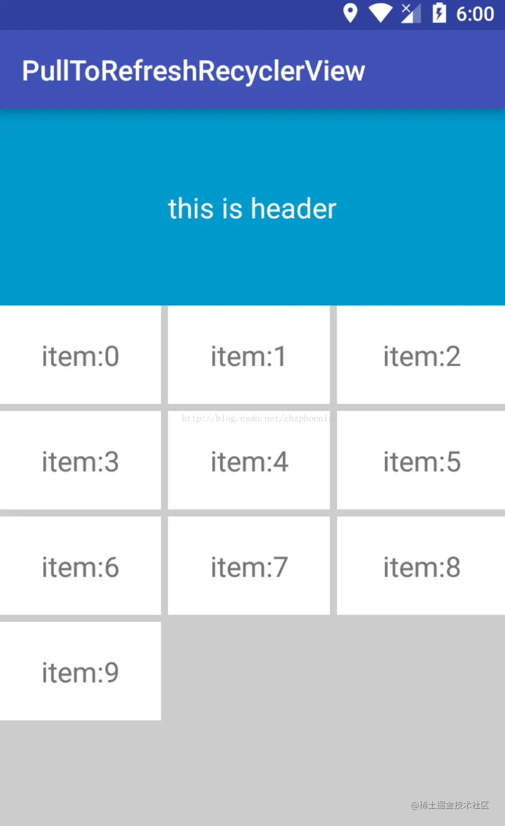 在ListView中我们经常使用header和footer功能,确实也给我们带来了不少方便,而且使用场景很多。但是在RecyclerView并没有默认实现这个功能,所以WrapRecyclerView首要任务就是添加这个功能。实现后的效果图如下: