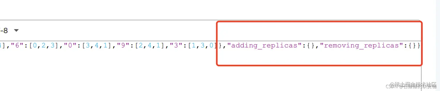 1、数据正在迁移中 判断数据是否在迁移中是通过判断topic的是否存在要新增或者删除的副本, 查询/brokers/topics/{topicName}节点中有没有这两个属性值