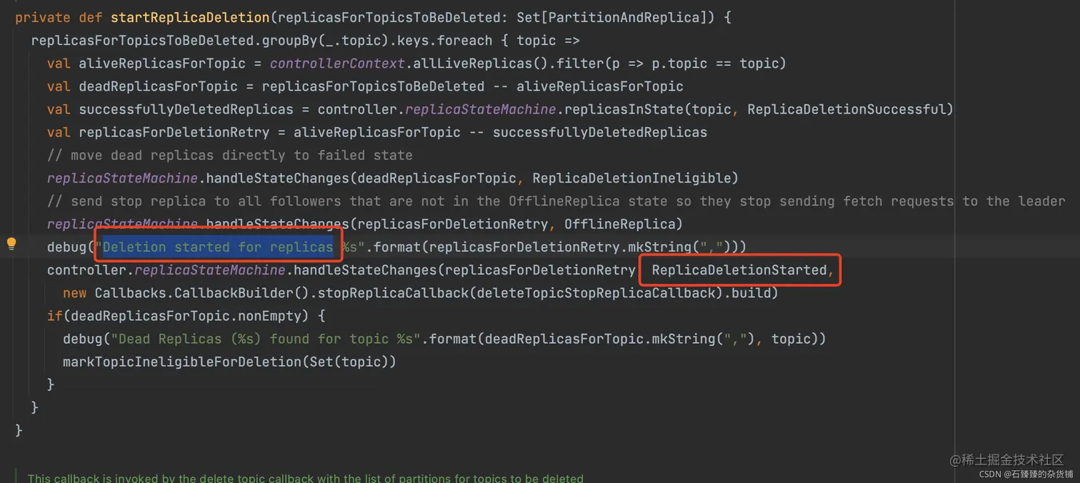 当前还未开始对该Topic进题删除; 判定条件是没有副本处于开始删除的状态「ReplicaDeletionStarted」(当然如果delete.topic.enable=false这条肯定满足)