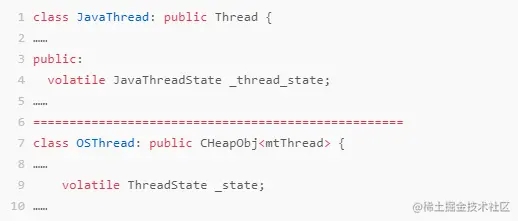 第二个问题:Java线程与OS线程共用一套线程状态吗?不是。JavaThread中有线程状态,OSThread也有线程状态。这个问题后面写篇文章细讲。