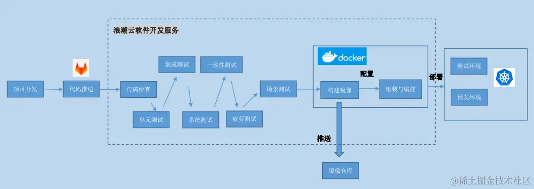 部署:执行流水线脚本将编译后的二进制打包到镜像中并推送到镜像仓库。通过HELM将二进制打包部署到kubernetes测试环境和预发环境,测试人员再进行进一步的测试工作。