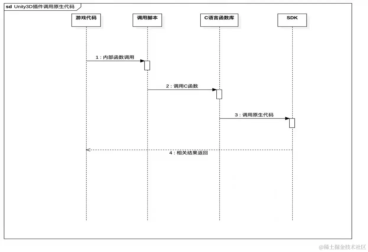 Unity3D插件的基础功能即实现游戏代码调用原生代码的一般流程如下图所示: