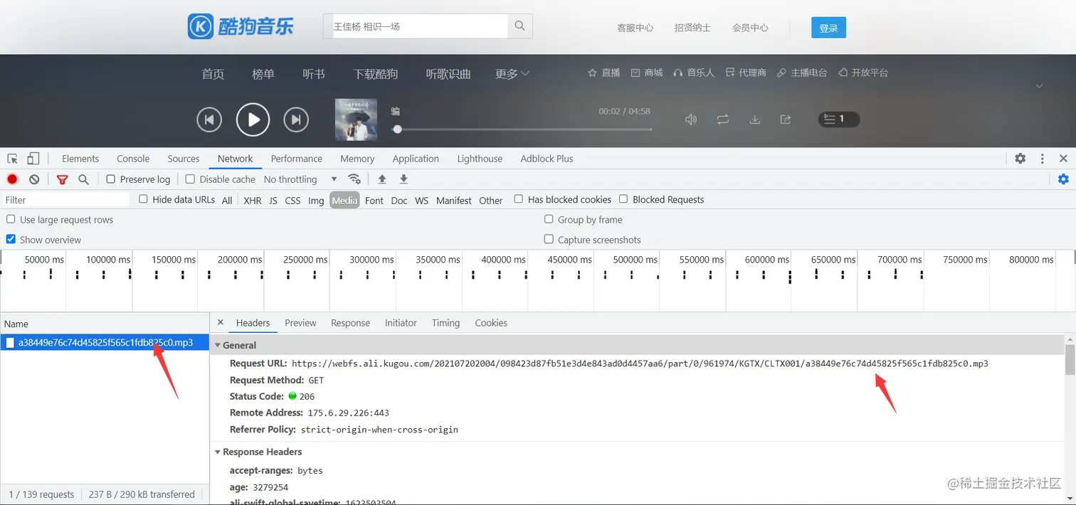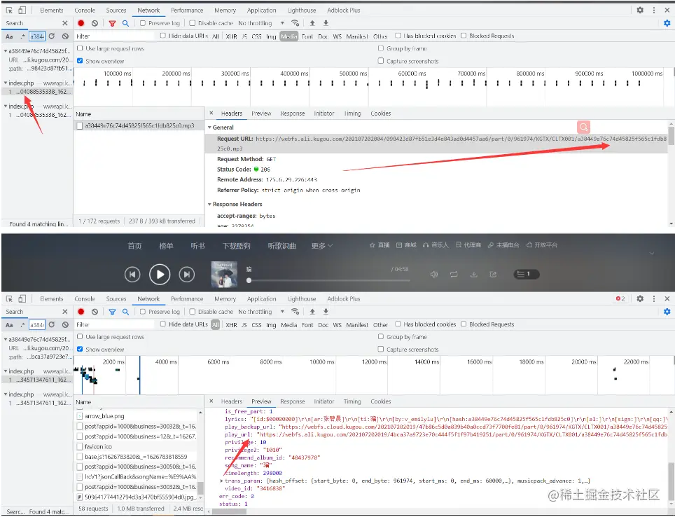 随意点击一个歌曲获取到音乐的详情数据 通过抓包的方式获取到音乐播放数据