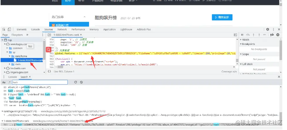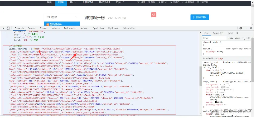 _ 可以明显看出来是时间戳 需要获取到对应的hash以及album_id的值 来到主页找寻对应的歌曲id数据 发现数据来自网页源代码